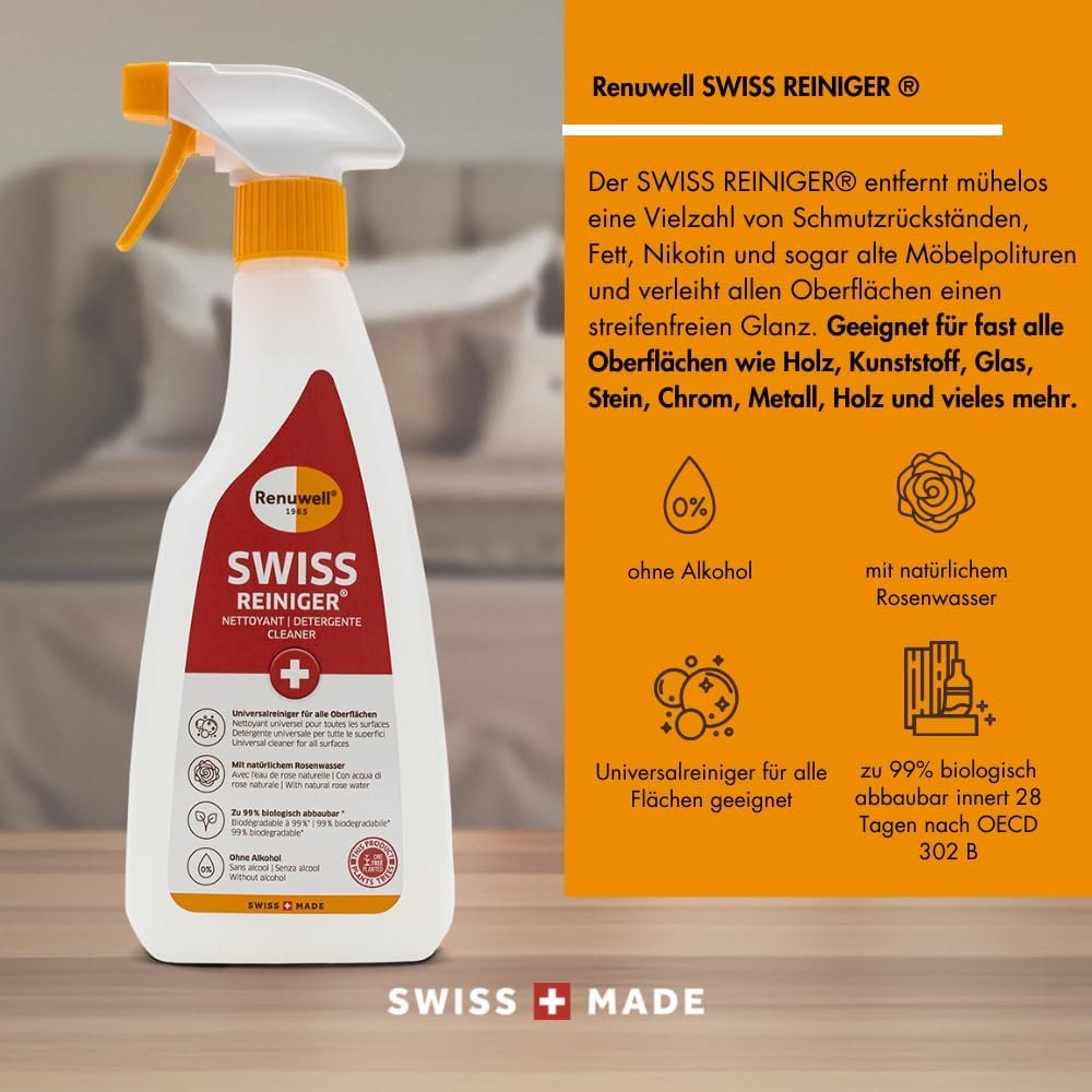 Renuwell Swiss Cleaner, 500 ml – Powerful Gentle Cleaning without Alcohol, Removes Grease, Dirt & Deposits, for Wood, Plastic, Metal & Stone, Swiss Quality