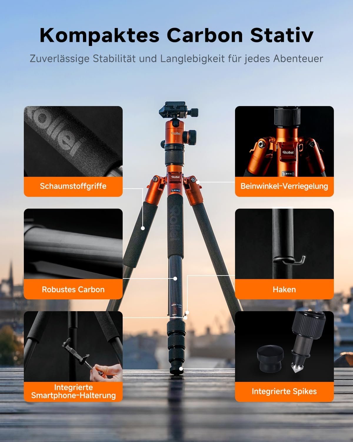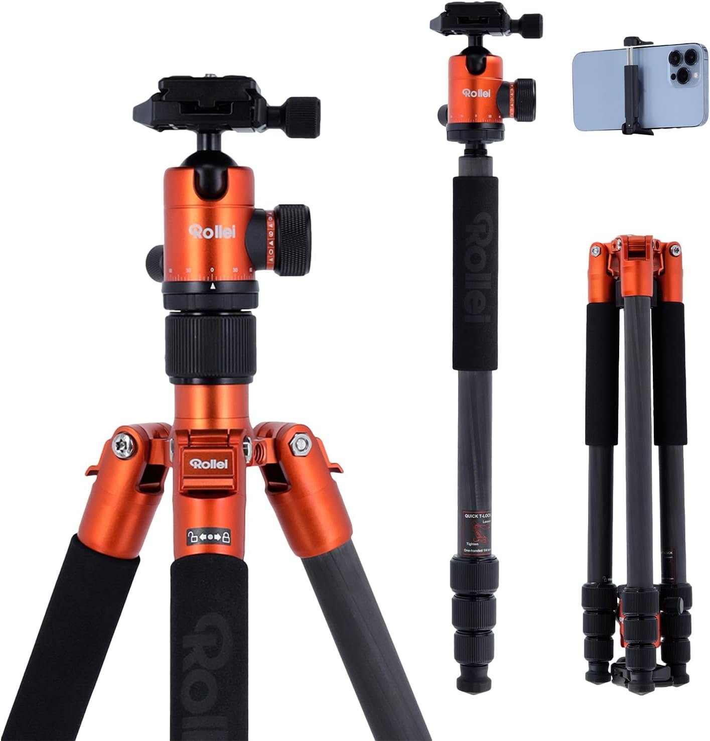 Compact and portable: the Rollei travel tripod weighs 1.22 kg and has a pack size of only 43.5 cm. With the Quick-Lock system, you can quickly and flexibly adjust the tripod height between 48.5 cm and 156 cm. This carbon fibre tripod is very portable and fits easily in almost any photo bag, ideal for travel and on the go