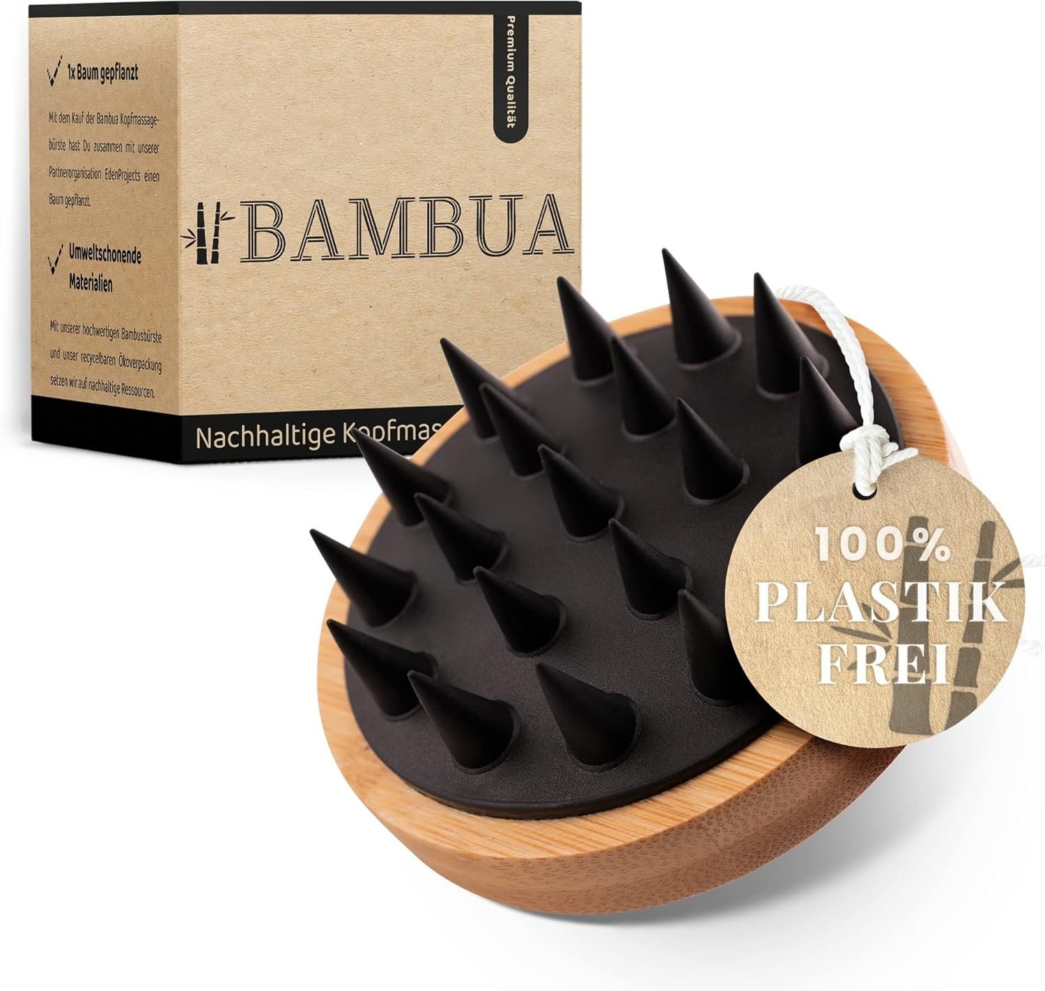 Premium scalp massage brush from Bambua. Enjoy sustainable cleansing and relaxation of your scalp with the BAMBUA Scalp Massager. Perfect as a tool against scalp dandruff. Frequent search terms: scalp massager dry scalp peeling brush anti-psoriasis scalp care hair shampoo head massager scalp scrub brush head massage curly girl method products birch water hair care shampoo hair peeling scalp oil hair growth agent head child wash hair wash brush no-flaky head brush. BAMBUA supports EdenForest – we plant 1 tree per product sold to achieve our goal of making the world more sustainable.