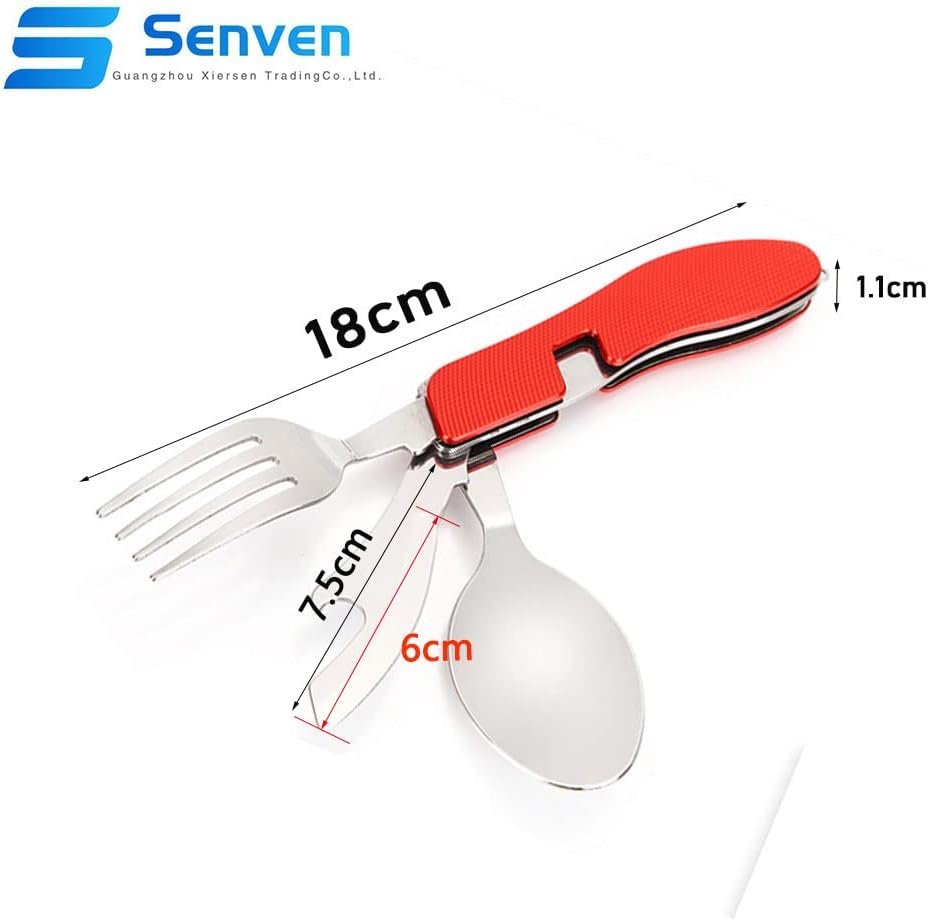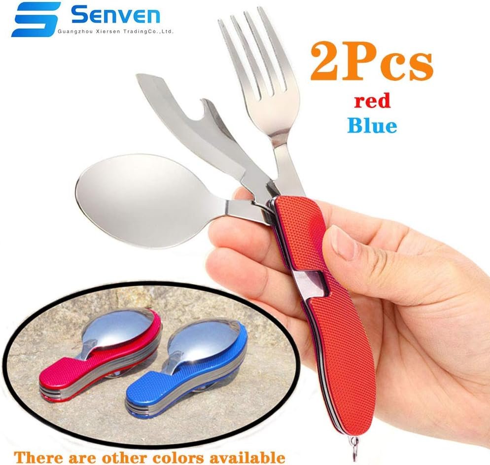 Senven 2 Pieces 4-in-1 Camping Tableware Camping Accessories Stainless Steel Fork Spoon Set Bottle Opener Camping Cutlery / Travel / Survival – Foldable, Removable, Red, Blue