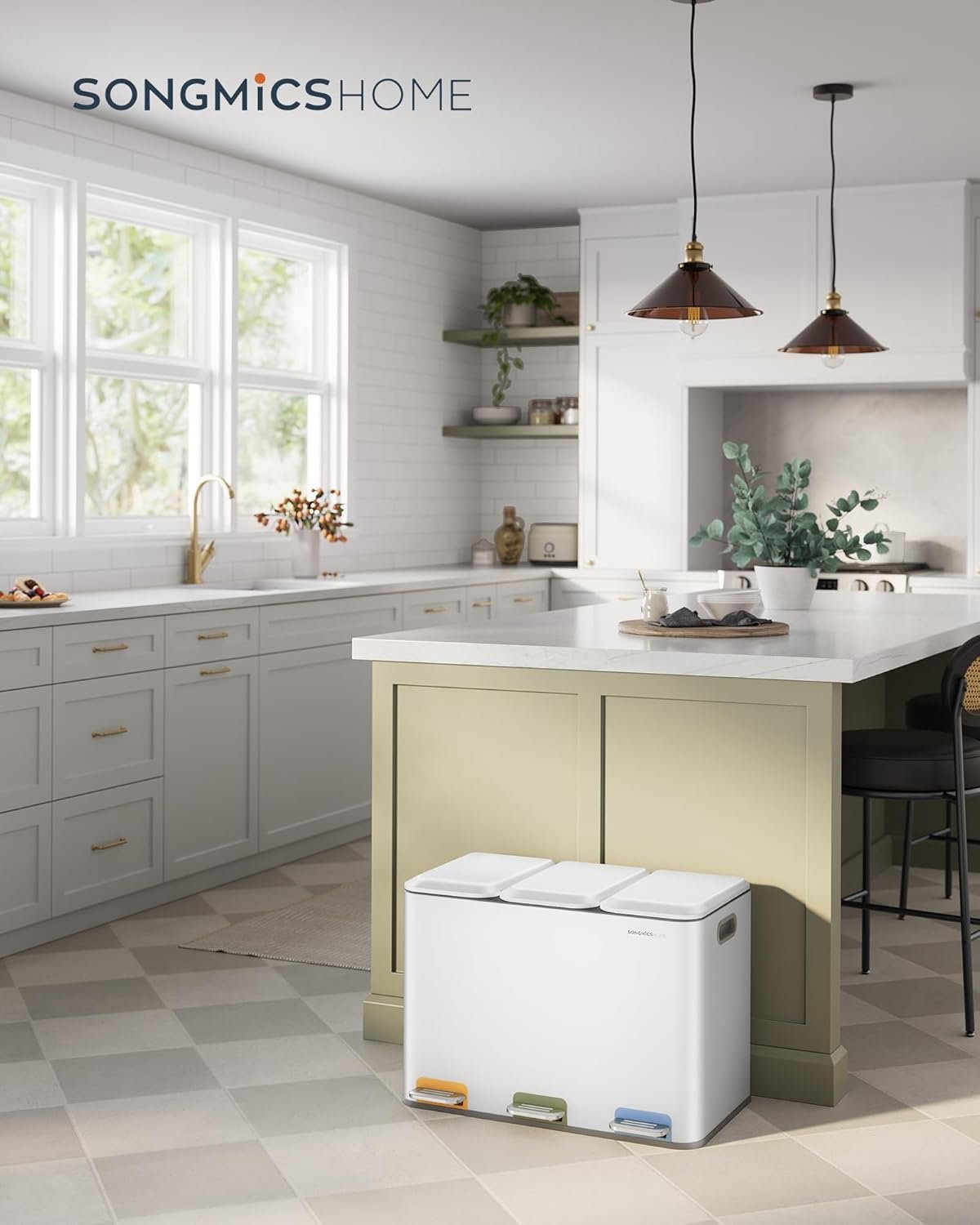 SONGMICS HOME Kitchen Rubbish Bin, 3 x 15 L Compartments, Waste Bin with Colour-Coded Pedals, Waste Separation System, with Lids and Inner Buckets, Steel, Cloud White LTB740W02V1