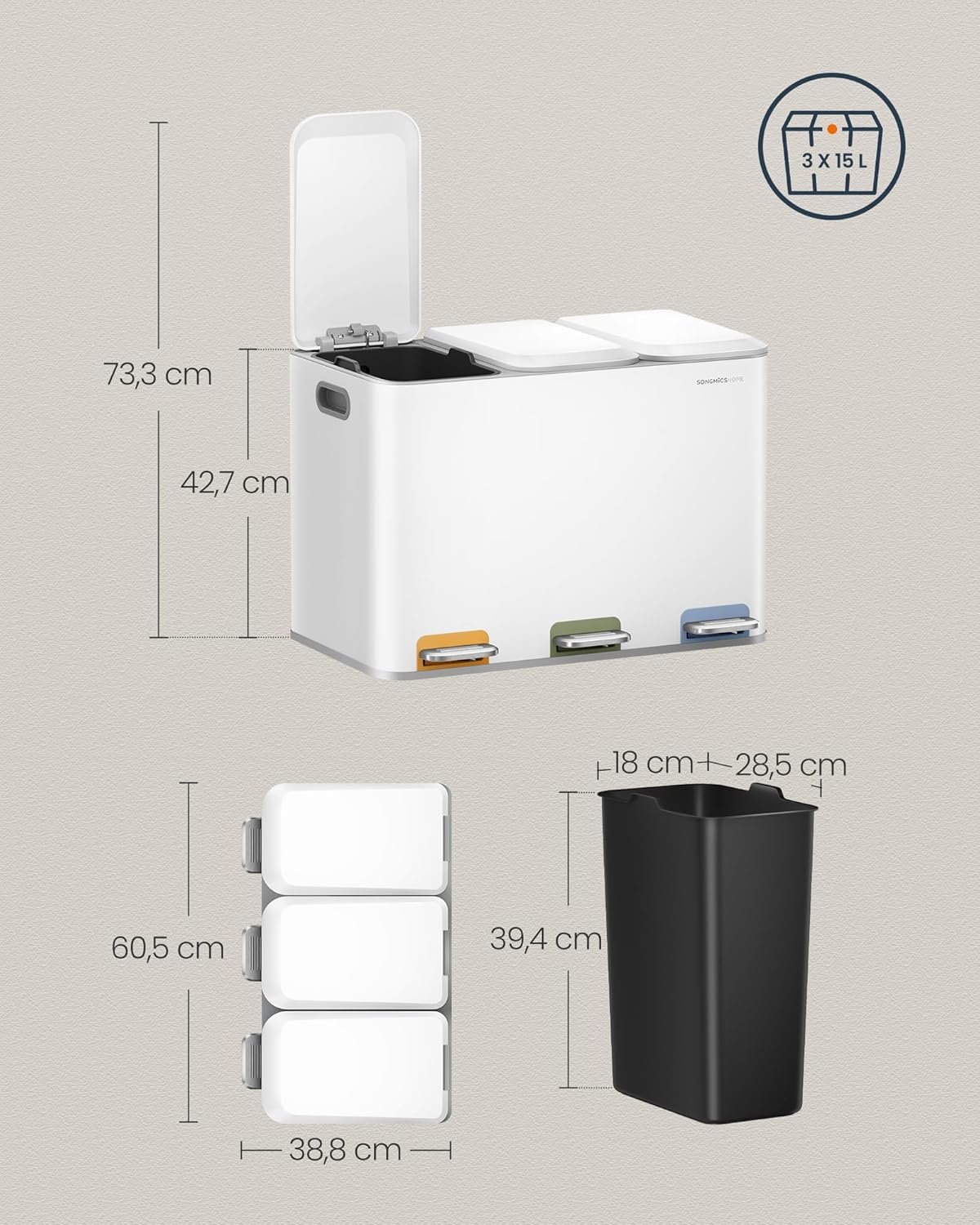 Effortless waste separation: Equipped with three 15 litre compartments, this kitchen waste bin makes it easier to sort recyclable materials, residual waste and organic waste. So your waste management works effortlessly!