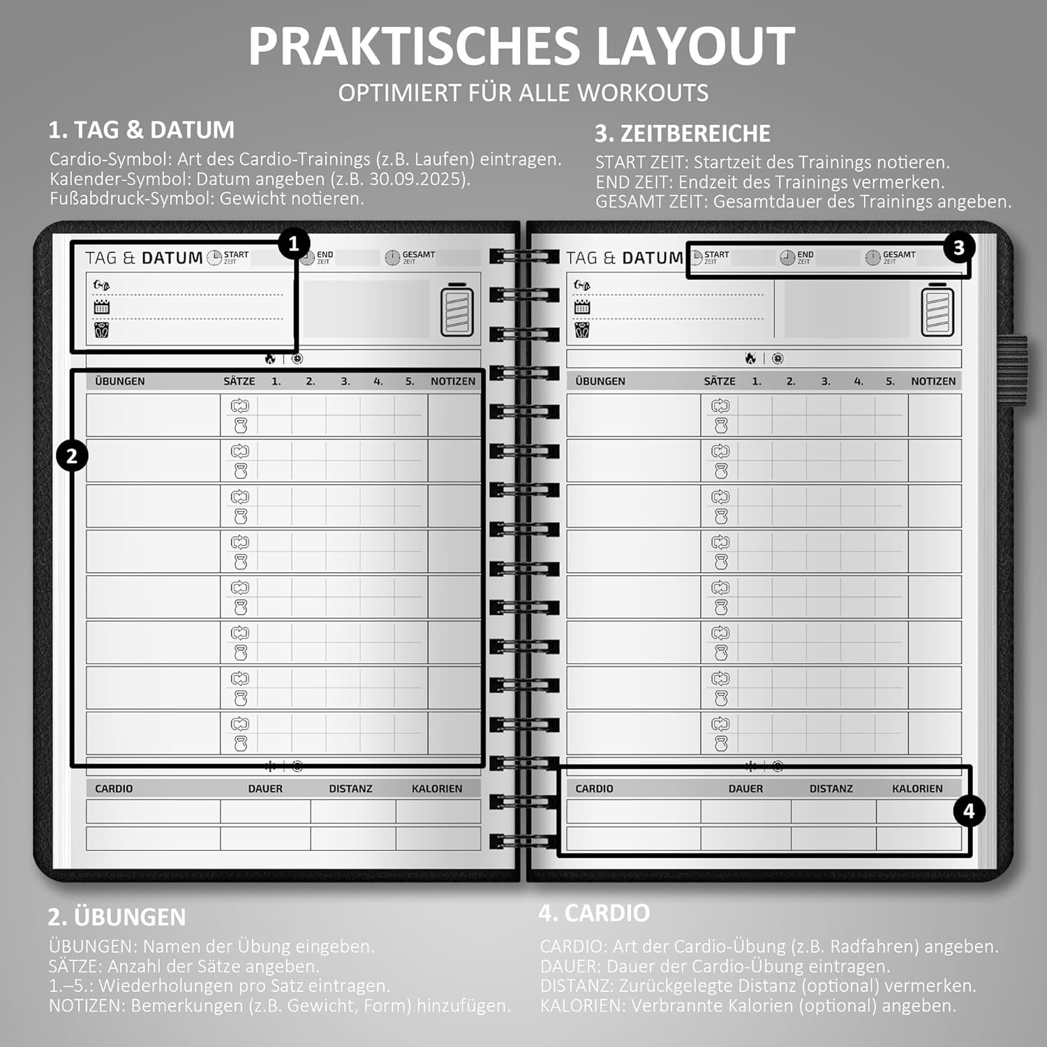 Extensive contents – The BIROYAL fitness journal contains a total of 212 pages, of which 186 pages to document your training sessions. In addition, it contains special overview pages such as “My successes”, personal records and a weight diary for recording body measurements. So you can keep an eye on all changes, see trends through weekly comparisons and stay motivated: your training diary makes progress objective, transparent and effective.