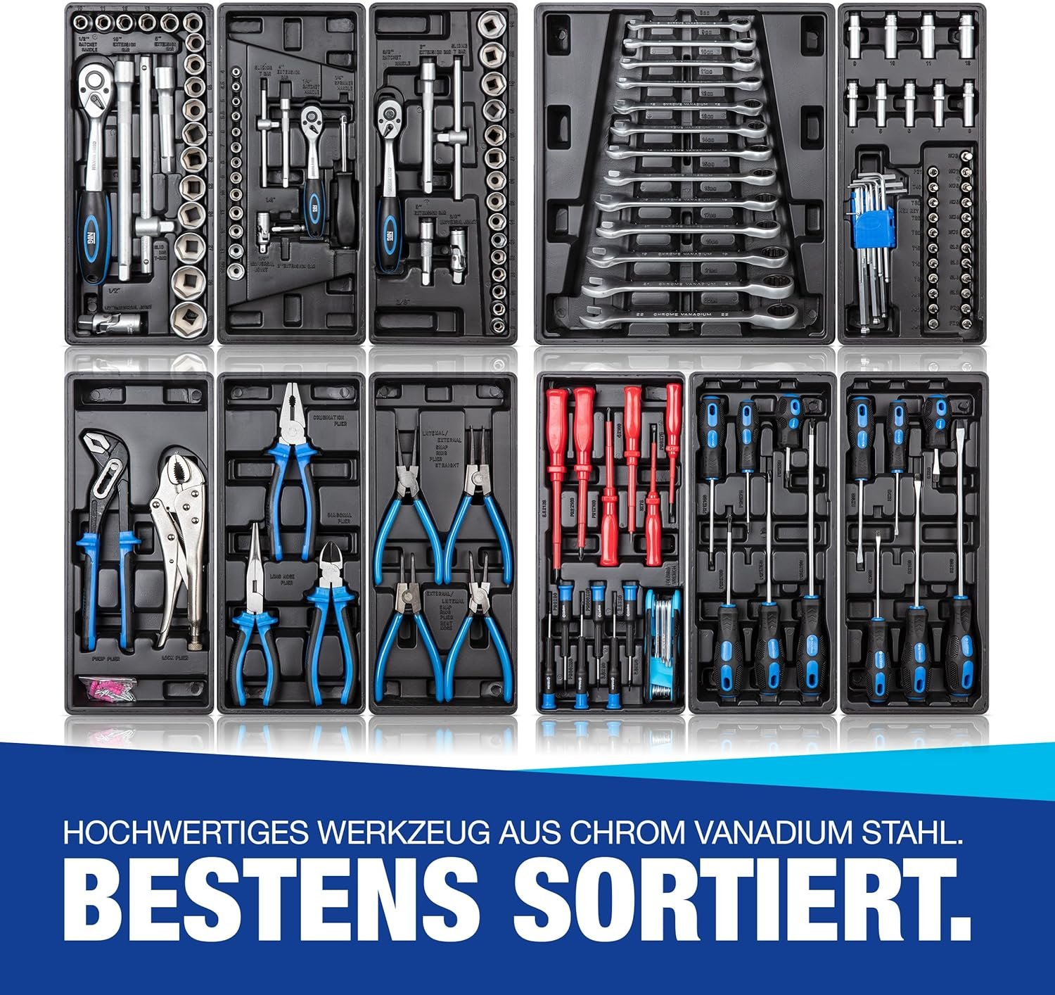 Comprehensive Tool Kit This tool trolley comes with an impressive tool kit that includes 220 pieces. Includes screwdrivers, socket wrenches, pliers, hammer, wrenches and many other tools.