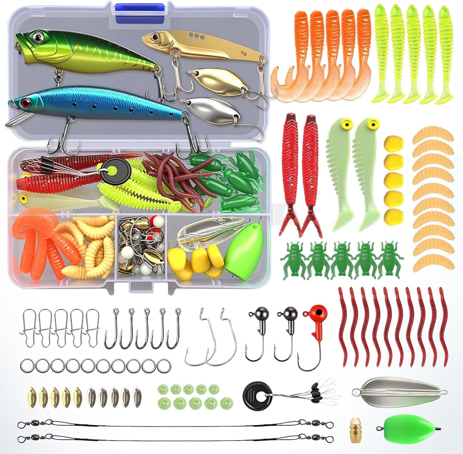 Contents of the set: Includes a 100-piece bait set as well as a portable transparent tool box (16.5 × 13 × 2.2 cm). Set includes poppers, floating minnows, VIBs, spoon baits, spinner leaves, earthworms, crickets, one-end maggots, corn, large shear toothfish, mealworms, spiral tail maggots, glow soft fish, leaders, bullet head boxes, lead head hooks, double rings, hook clips, glow beads, dummy heads and crank hooks