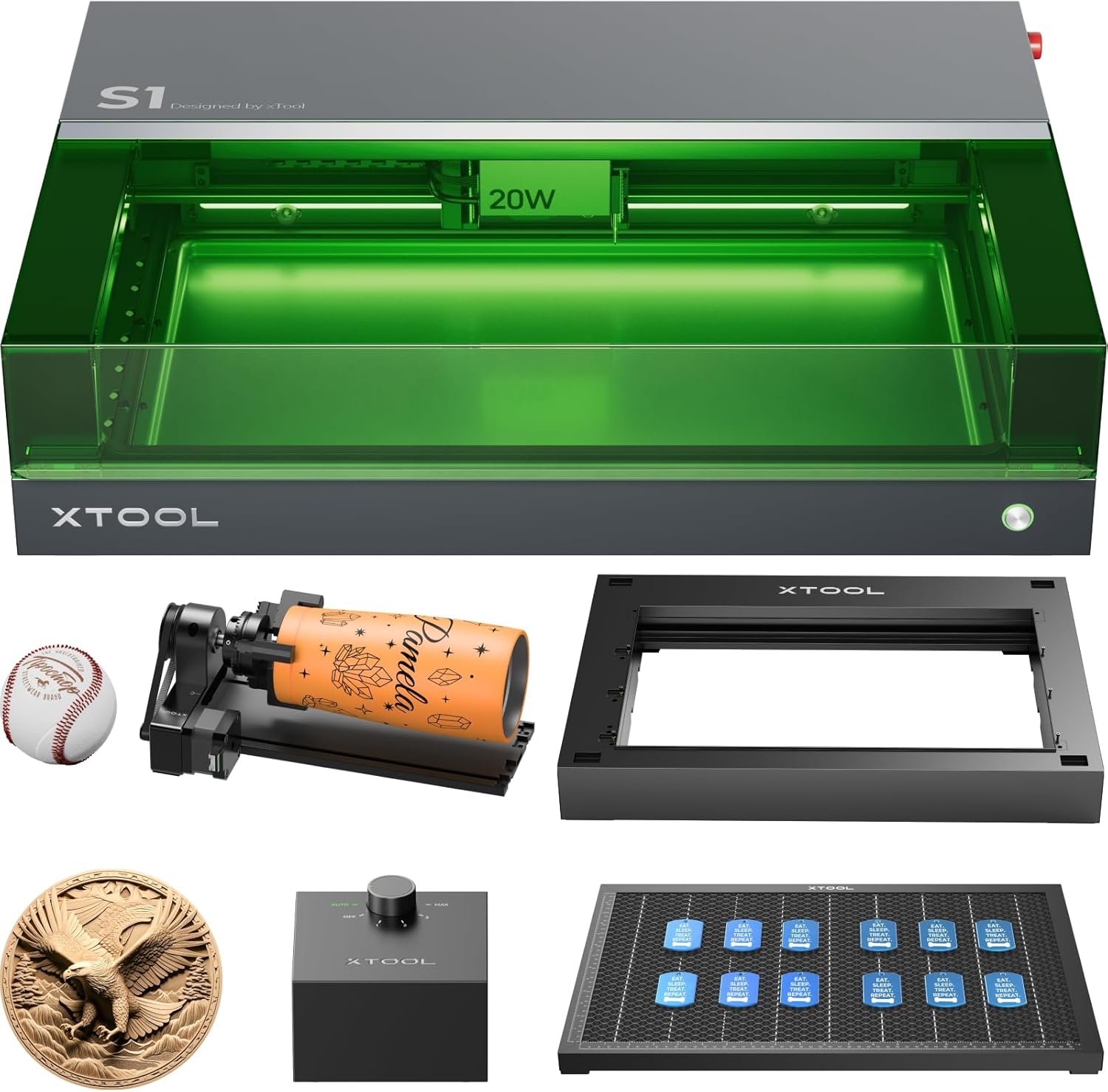 ONE STOP SOLUTION WITH MULTIPLE ACCESSORIES Equip your xTool S1 with versatile attachments and discover endless possibilities: the 4-in-1 RA2 Pro is suitable for 90% of cylindrical objects such as cups, wine glasses and rings. The honeycomb panel and intelligent air support provide cleaner, flawless results, while the raised base provides a greater working height. All your creative tools are now in one package.